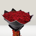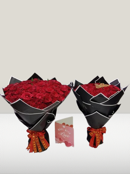 An expression of love and celebration of a bond with 50 stems of red roses bouquet and a 1kg red velvet cake recipe that is heart shaped. The package also has a card for writing personalized message.