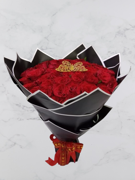 An expression of admiration, love and romance with 50 stems of red roses bouquet, a walker classic chocolate and a 1kg red velvet cake recipe that is heart shaped. The package also has a card for writing personalized message.