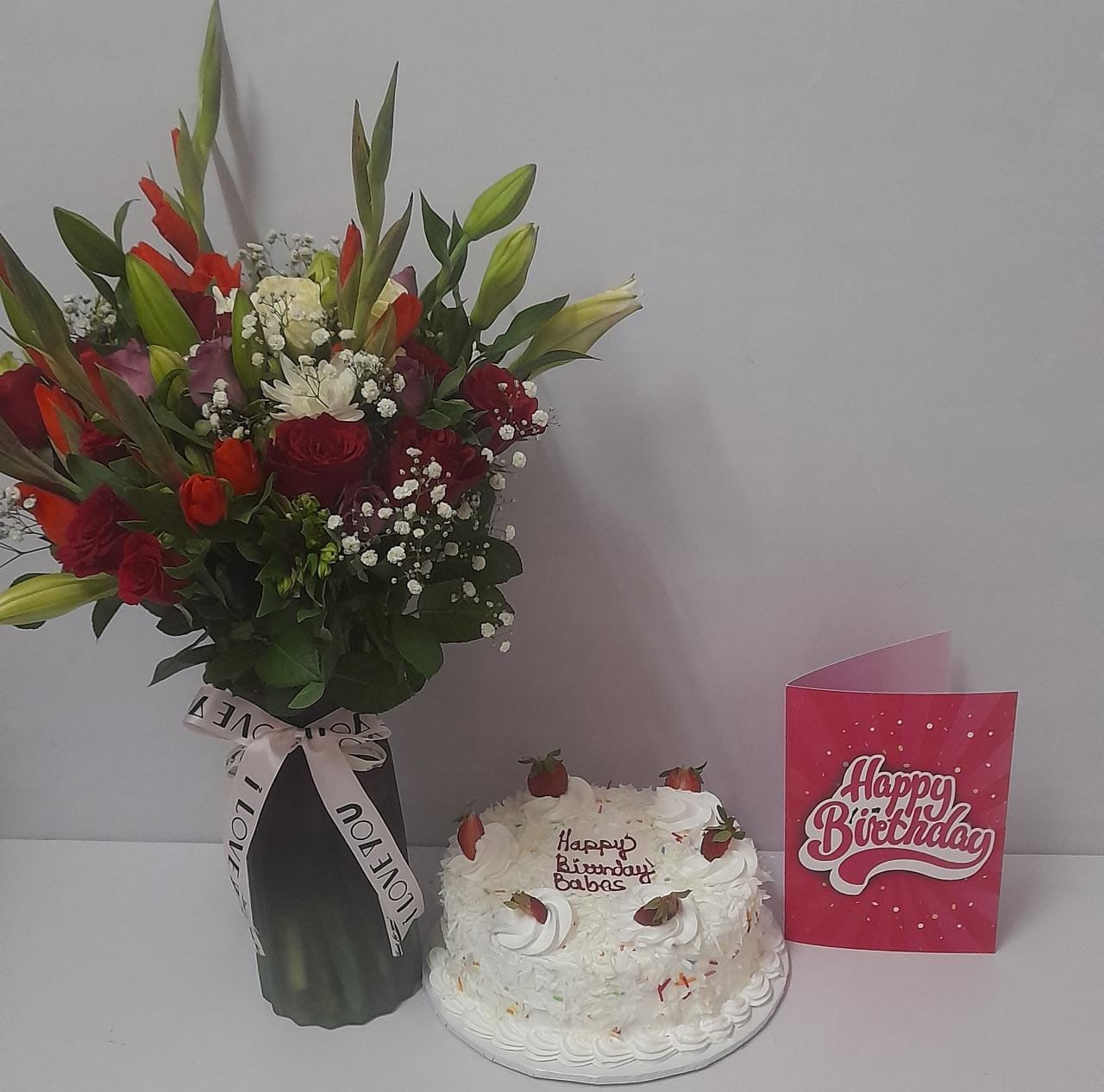 A birthday package deal with a medium sized flowers bouquet and 1 kg recipe of a chocolate vanilla cake. For same day delivery order before 3pm.