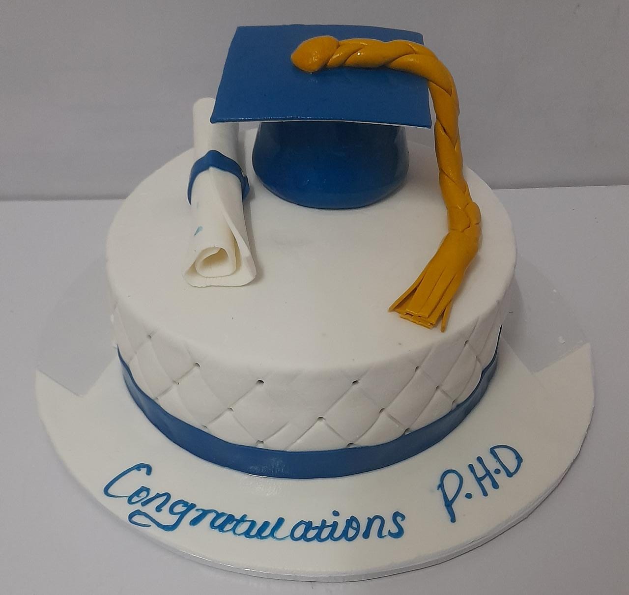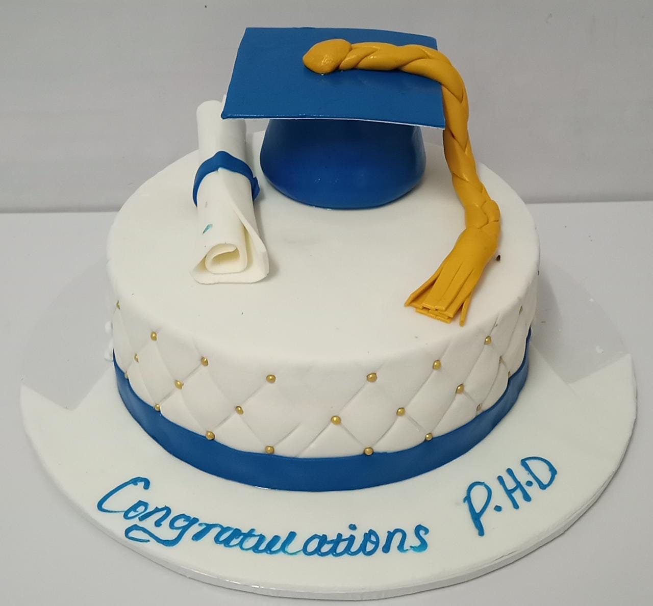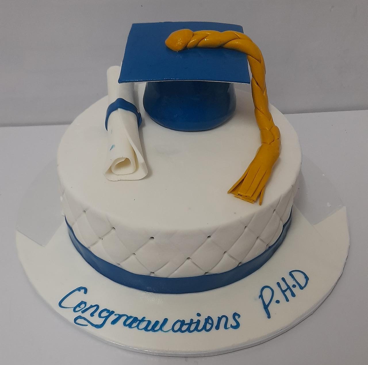 A graduation themed cake with fresh cream cake. The cake flavour is a mix of chocolate and vanilla. Order by 3pm for same day delivery.