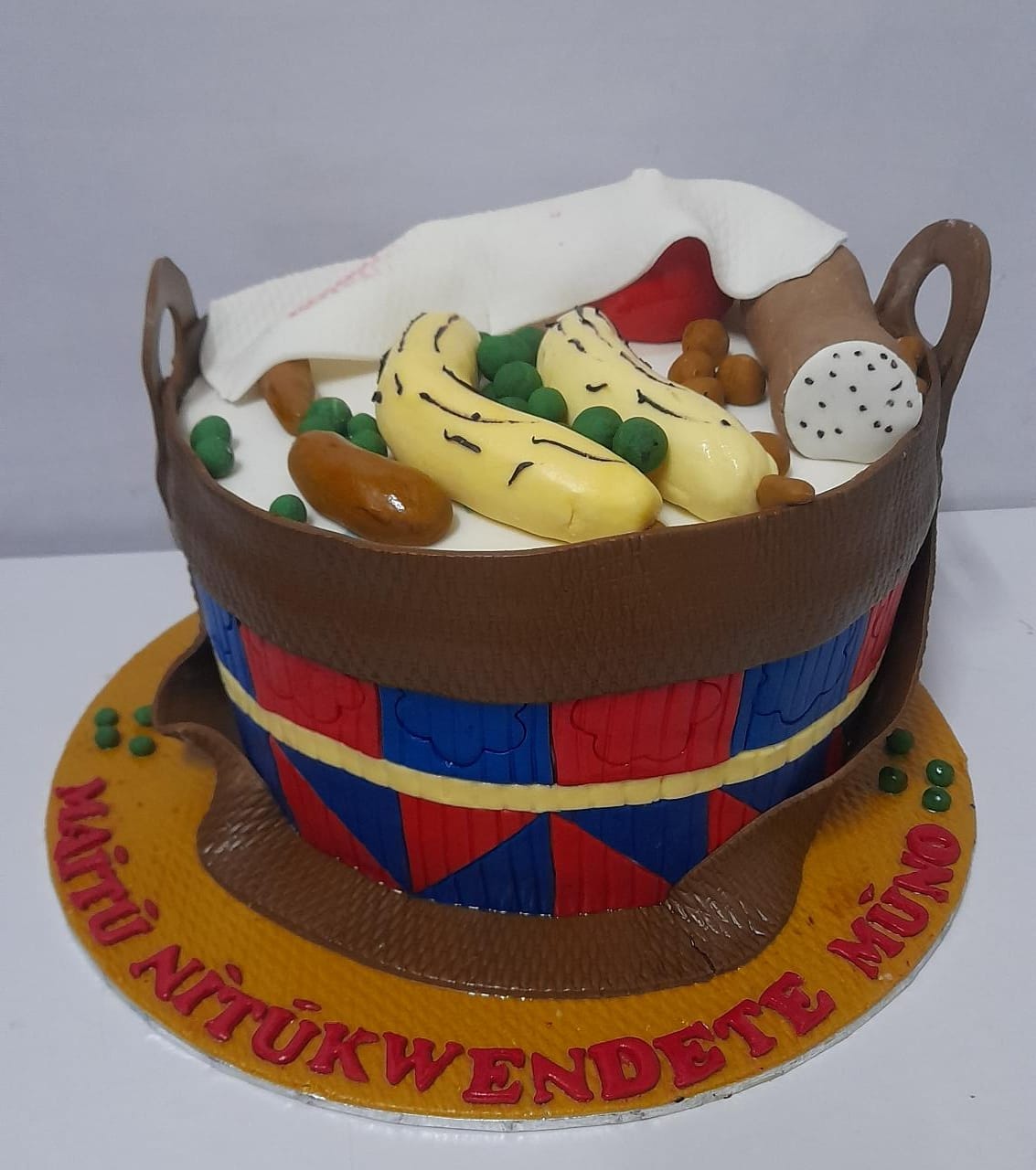 A traditional kiondoo themed fondant cake to impress mama on special occasions such as thanks giving, retirement party or ruracio. The cake flavour is vanilla and chocolate. This cake minimum size is 2kg.