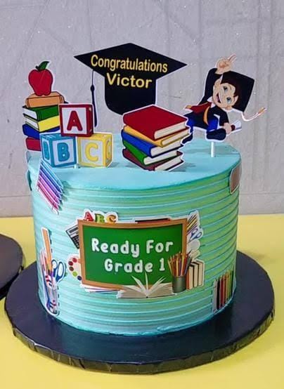 A graduation Cake themed to celebrate achievement. The cake has a graduation cap and the student name. The cake flavour is vanilla and chocolate. This cake minimum size is 1kg.
