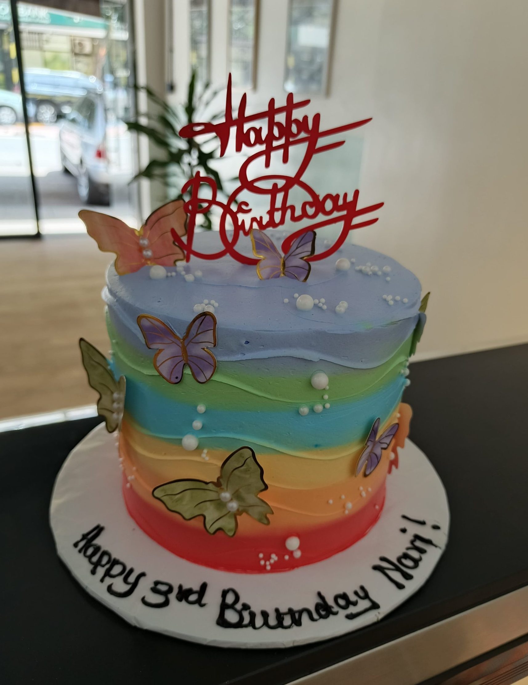 A rainbow colours cake beautifully coloured to impress her highness. The minimum cake size is 1.5kg to allow the baking of every colour separately. The flavours for the cake are red velvet, blueberry, orange, passion, and vanilla. Order by 12noon for same day delivery.