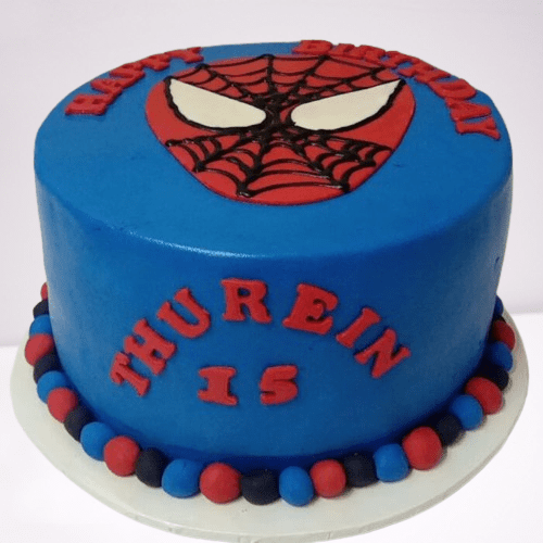 A spiderman themed fondant cake with head customization. The cake flavour is vanilla. This cake minimum size is 1.5kg.