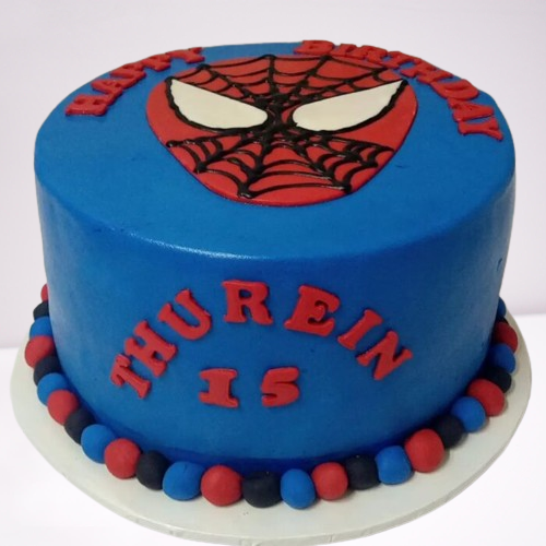 A spiderman themed fondant cake with head customization. The cake flavour is vanilla. This cake minimum size is 1.5kg.