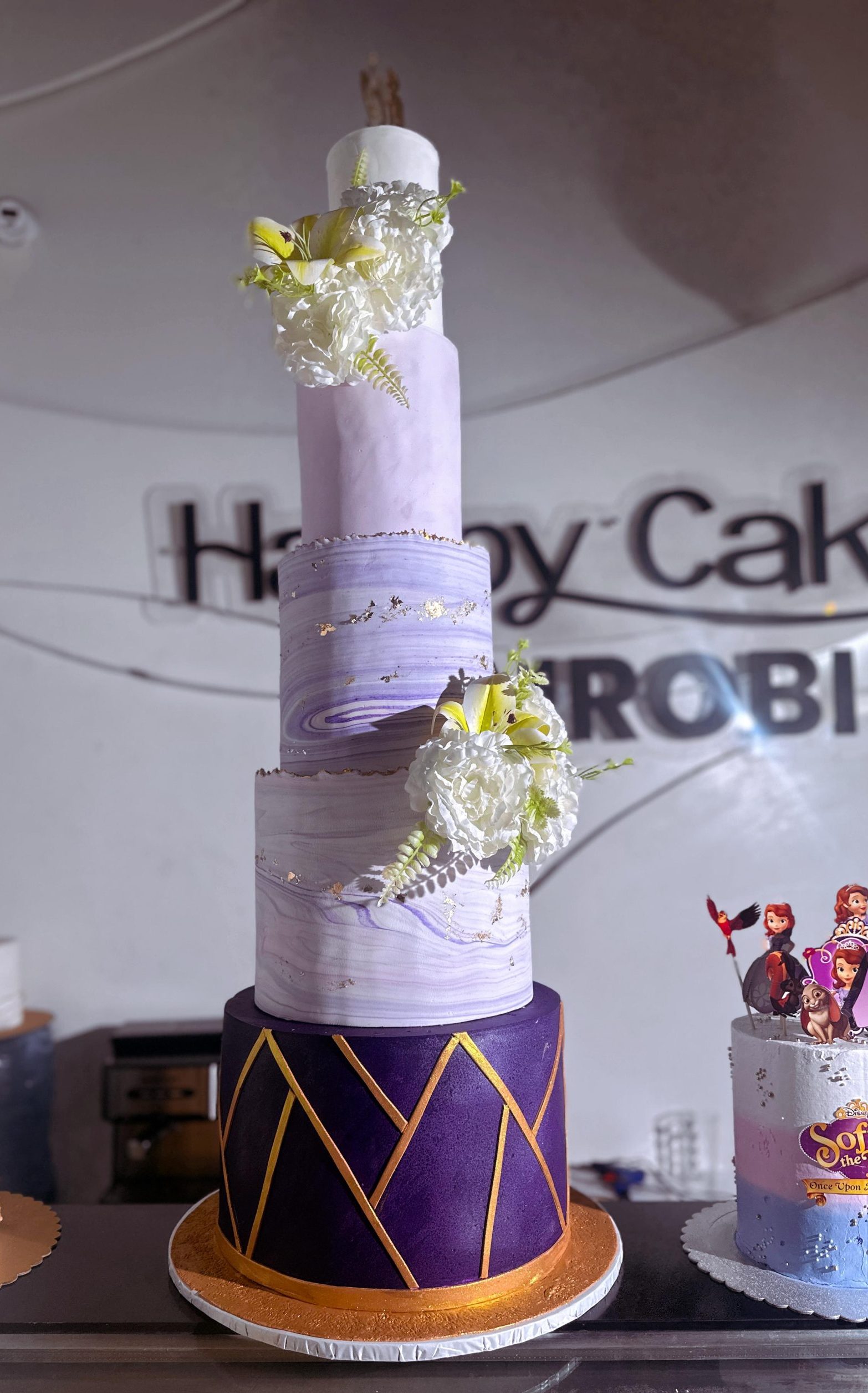 A breathtaking five-tier masterpiece blending elegance and artistry. This Royal Amethyst Wedding Cake features soft lilac and white tones, accented with gold geometric patterns and delicate floral touches. Perfect for couples who want a grand statement on their big day. Simply timeless, tall, and made to impress.